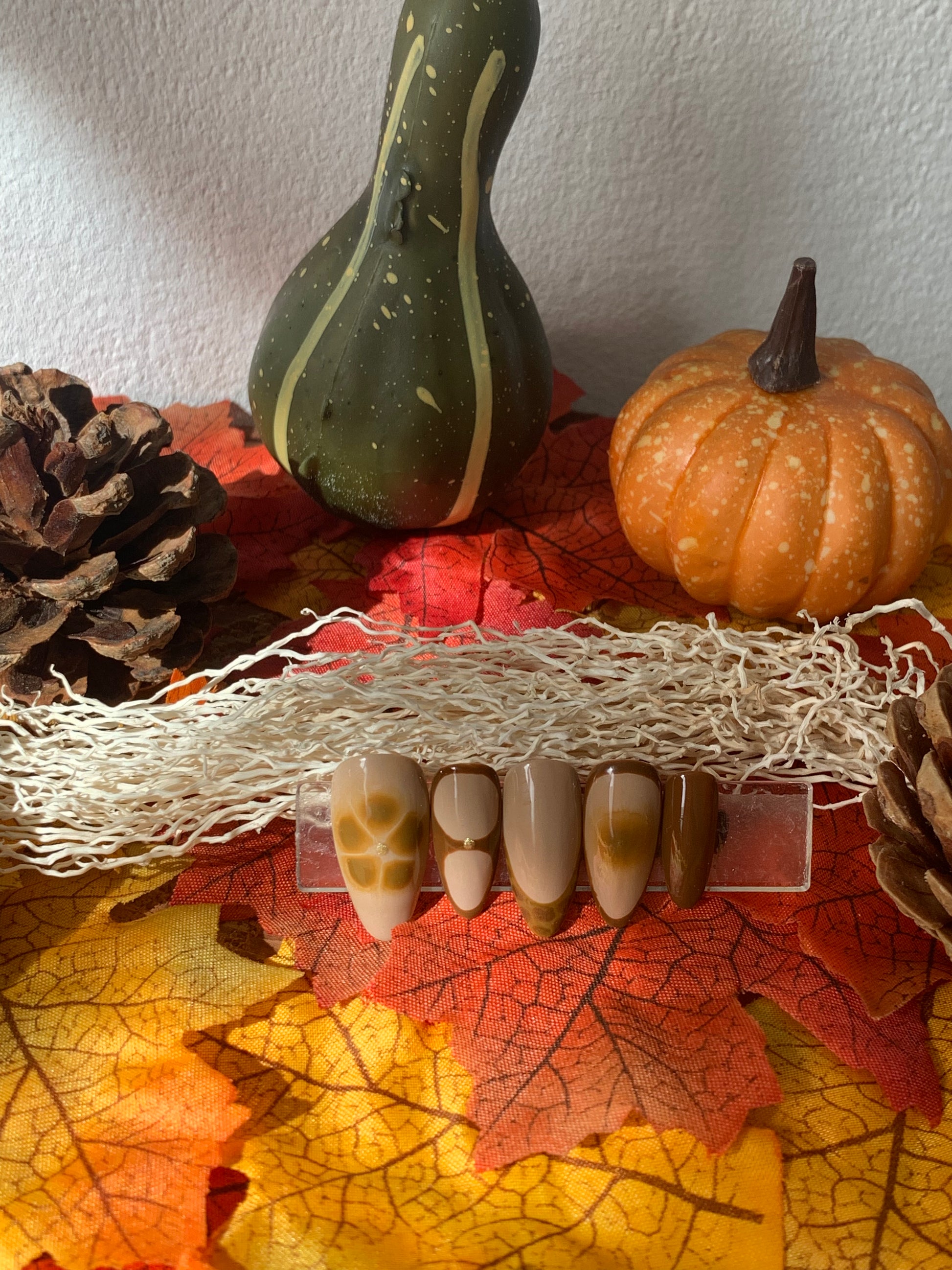 Plongez dans l'ambiance chaleureuse de l'automne avec ce set de press on nails élégant et raffiné. Dans des tons riches de caramel, noisette et doré, agrémentés d'effets marbrés et écaille de tortue, ces press on nails sont l'accessoire parfait pour la saison. Chaque design est réalisé avec soin, alliant nuances naturelles et finition brillante. Idéal pour celles qui aiment les styles chics et de saison, en parfaite harmonie avec vos tenues automnales.