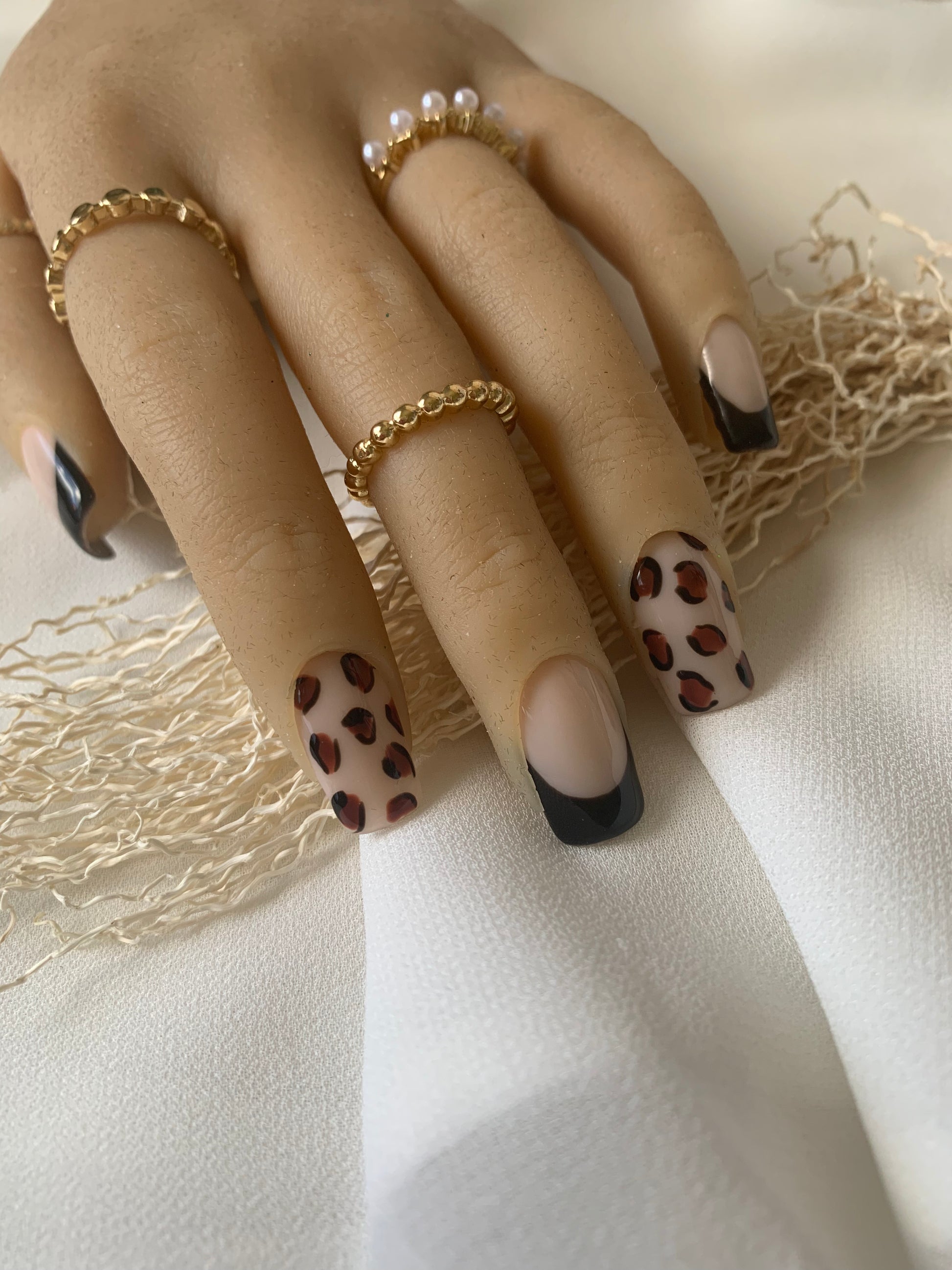 Laissez parler votre côté sauvage avec ce set Glam Safari. Chaque ongle allie un fond nude élégant à des finitions audacieuses: des French manucures noires contrastent avec un motif léopard irrésistible, pour une allure à couper le soufle.