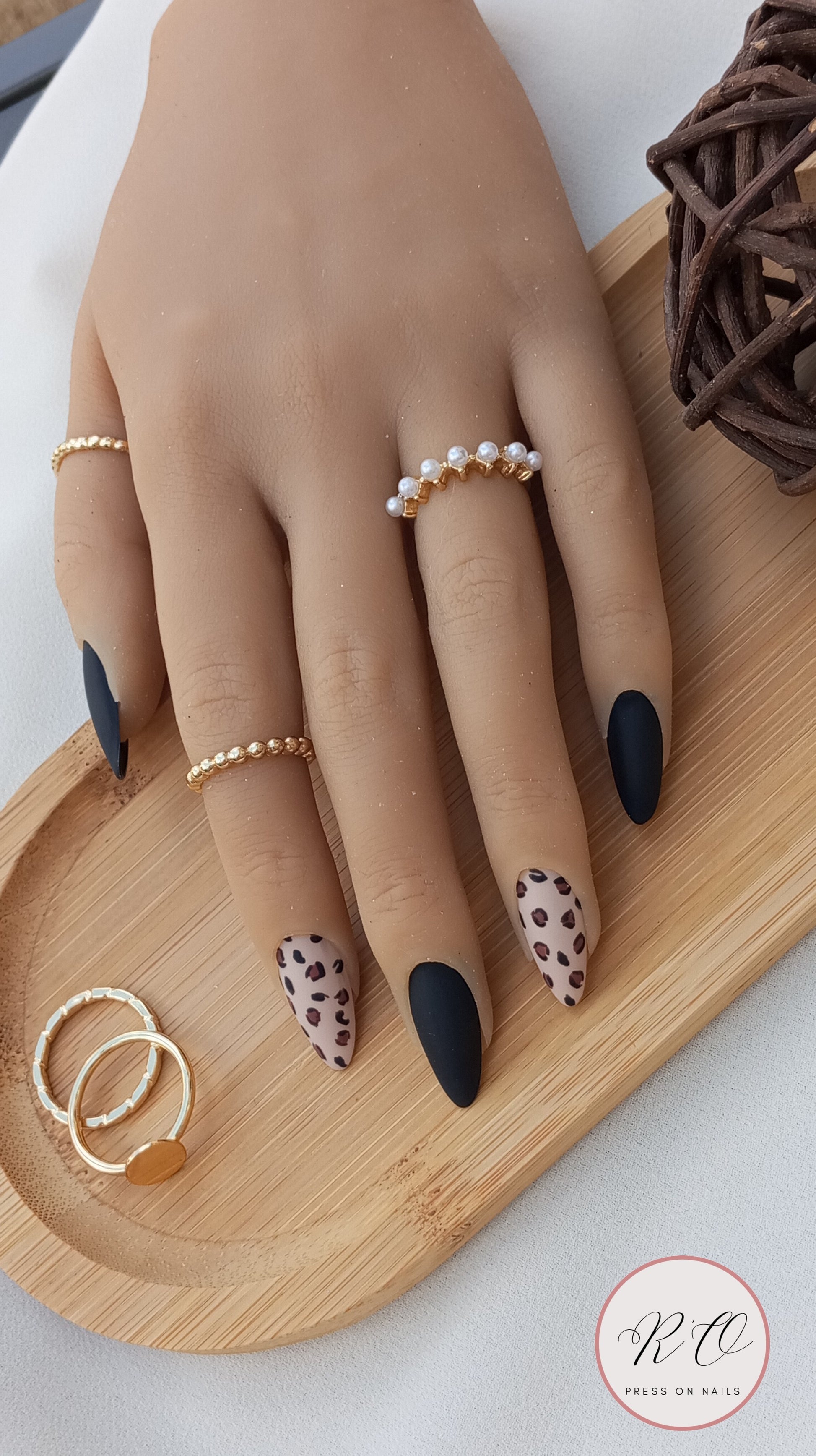 Réveillez votre côté sauvage avec le modèle Féline chic ! Ces faux ongles noir matte mettent en valeur vos mains avec des motifs léopard audacieux. Ajoutez une touche de férocité à votre style tout en gardant un look élégant. Parfait pour les occasions spéciales ou juste pour vous faire plaisir.