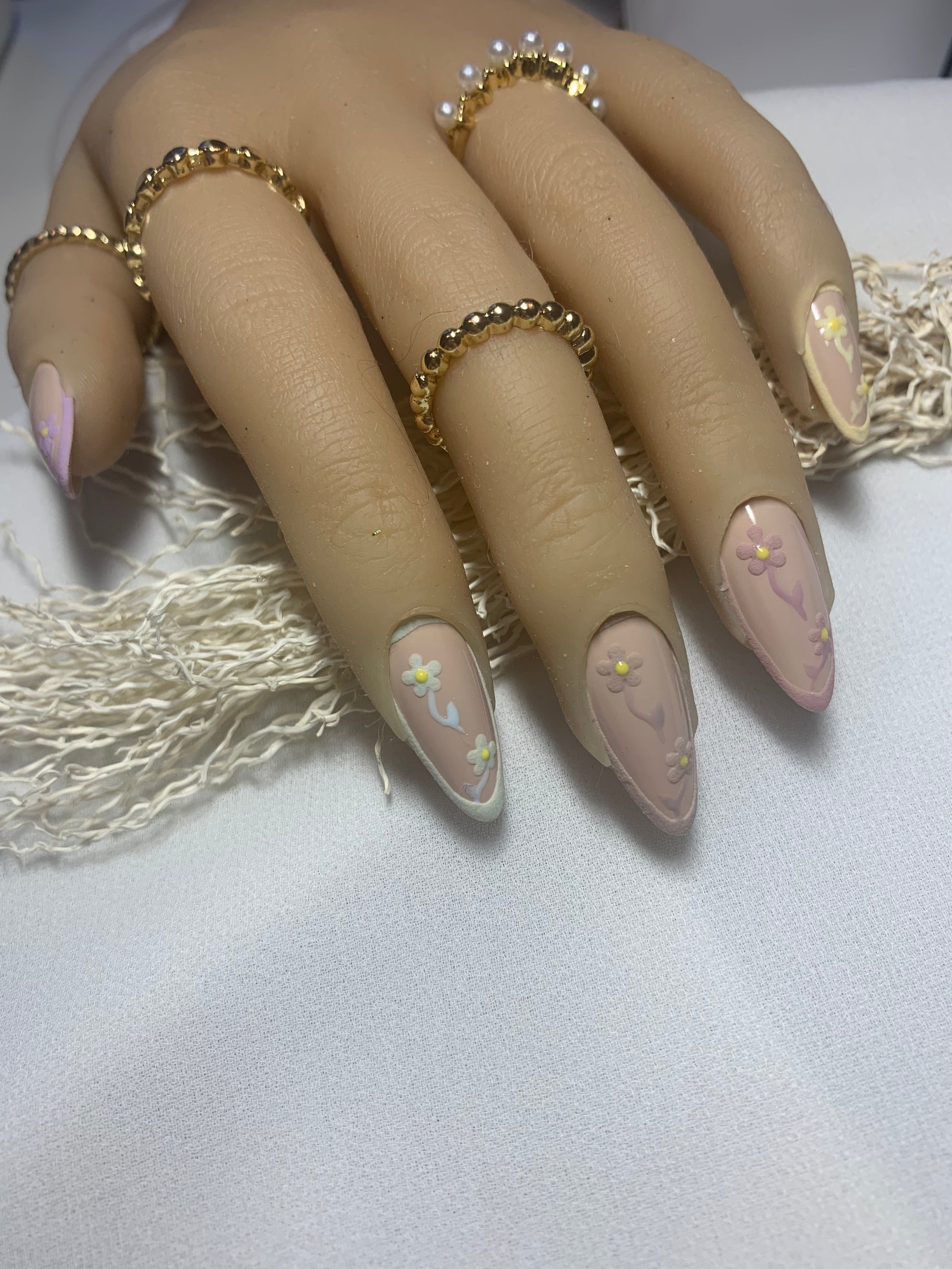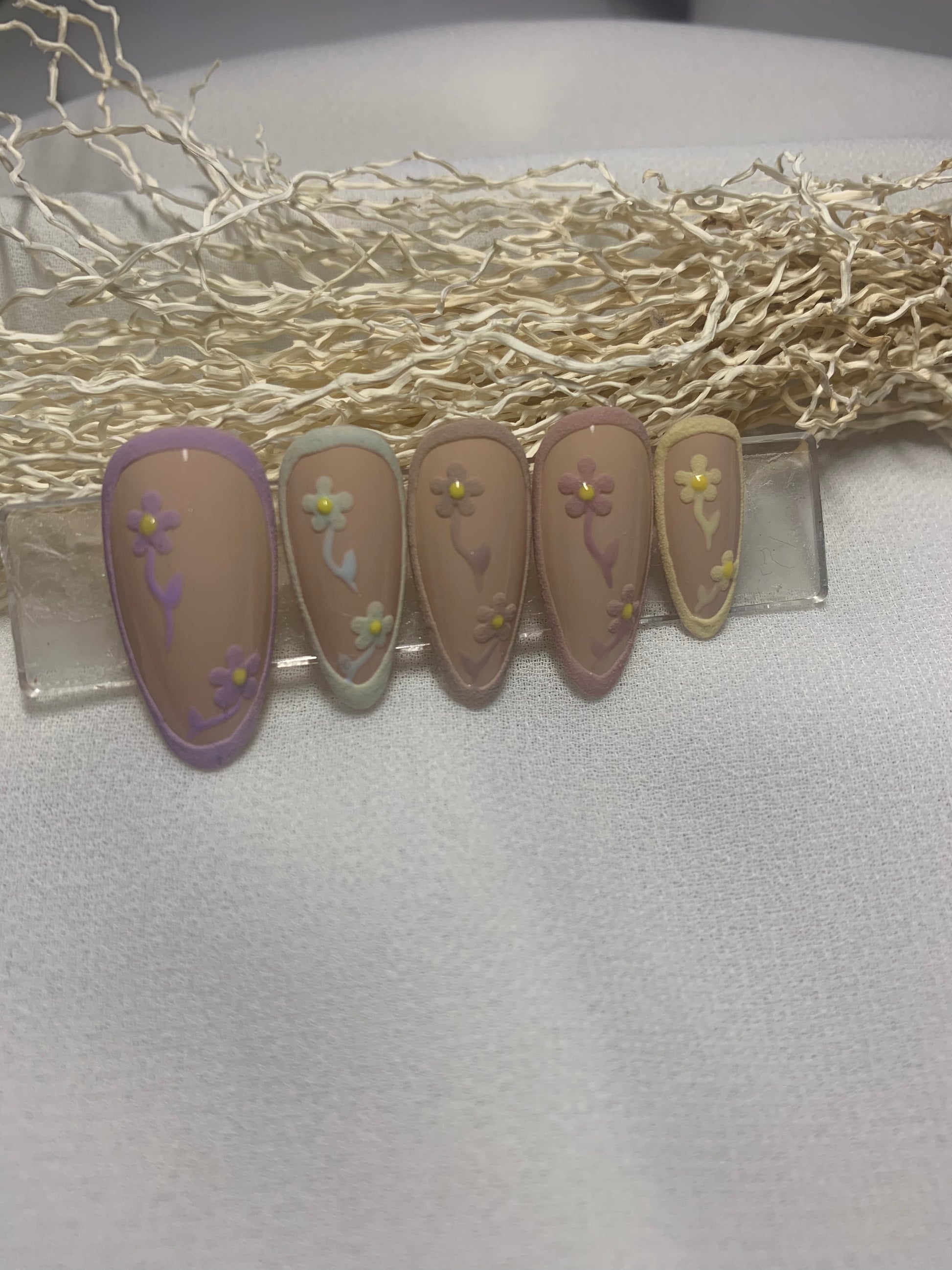 Sublimez vos mains avec cet élégant set de press on nails au design floral. Chaque ongle présente une base nue réhaussée d'un motif de fleurs délicates au couleurs pastel. Les contours sont recouverts d'une poudre acrylique.