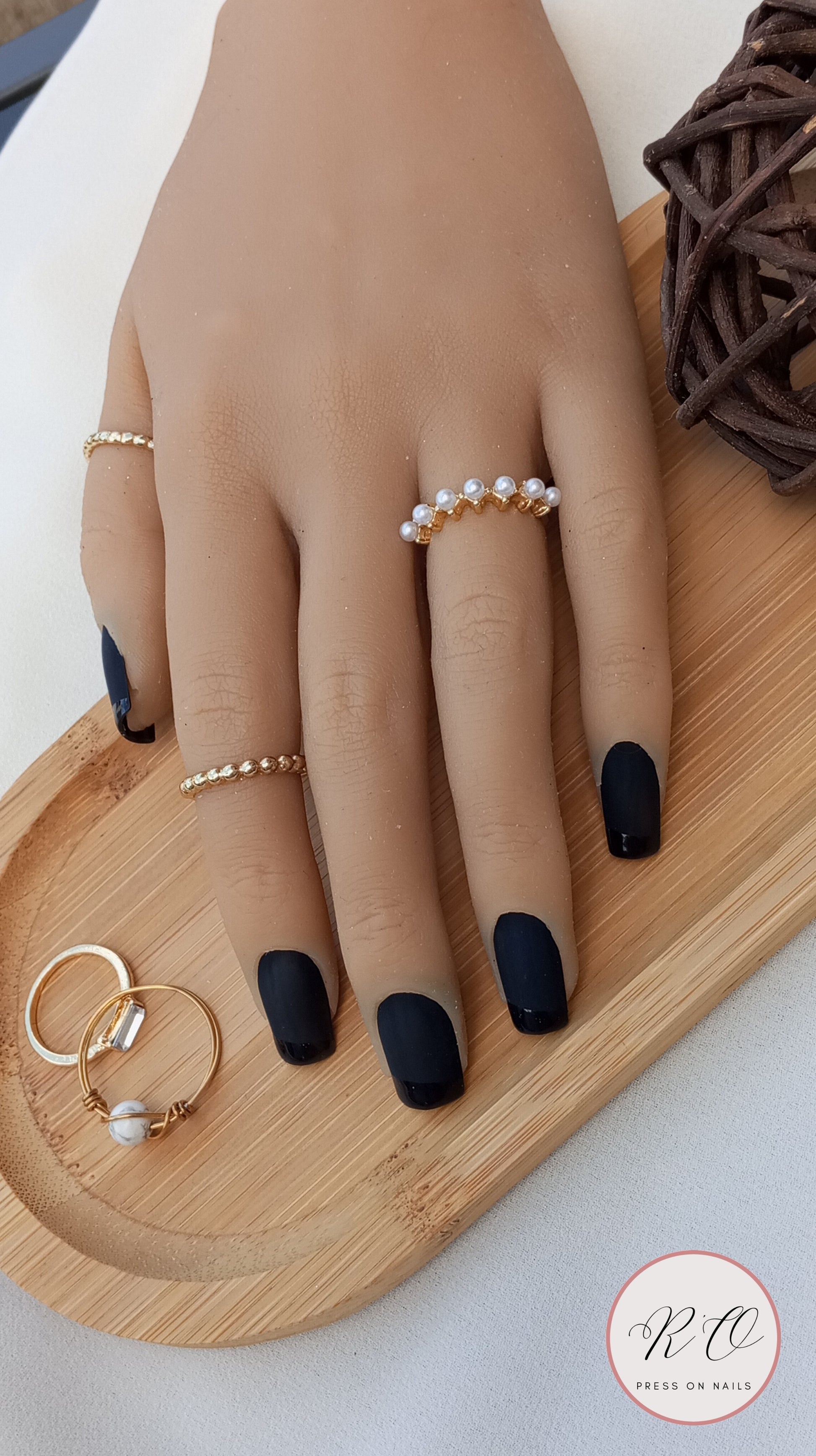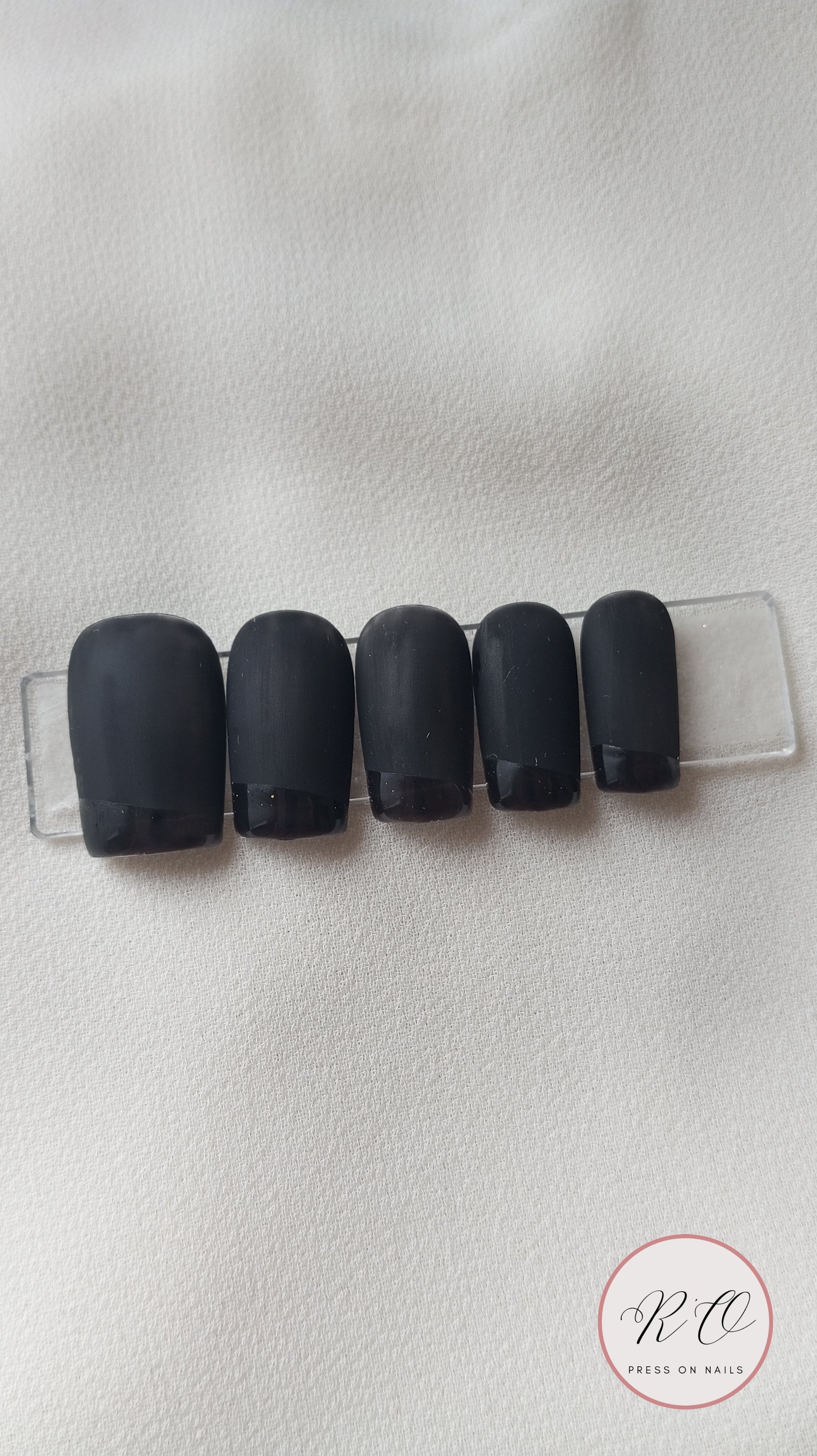 Sublimez vos ongles avec le modèle Velvet black. Des faux ongles noir uni matte et demi french brillante qui ajoutent une touche de sophistication et d'élégance à vos mains. Parfait pour toutes les occasions, ces faux ongles vous feront vous sentir confiante et prête à conquérir le monde !