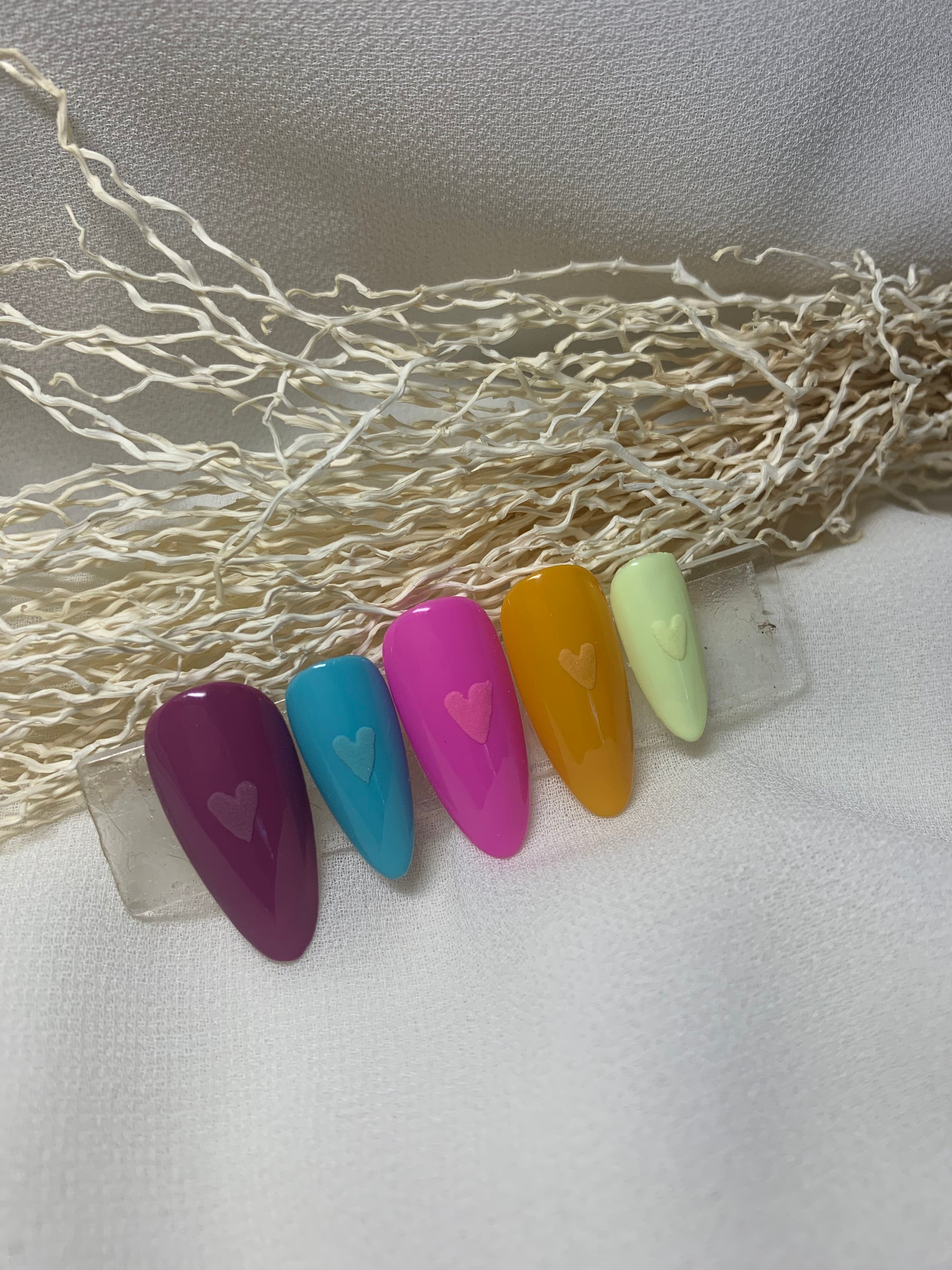Le set Kamila est LE set de press on nails à avoir pour cet été. Chaque capsule arbore une teinte vibrante, sublimée par un coeur en ton sur ton qui ajoute une touche de douceur et de féminité.