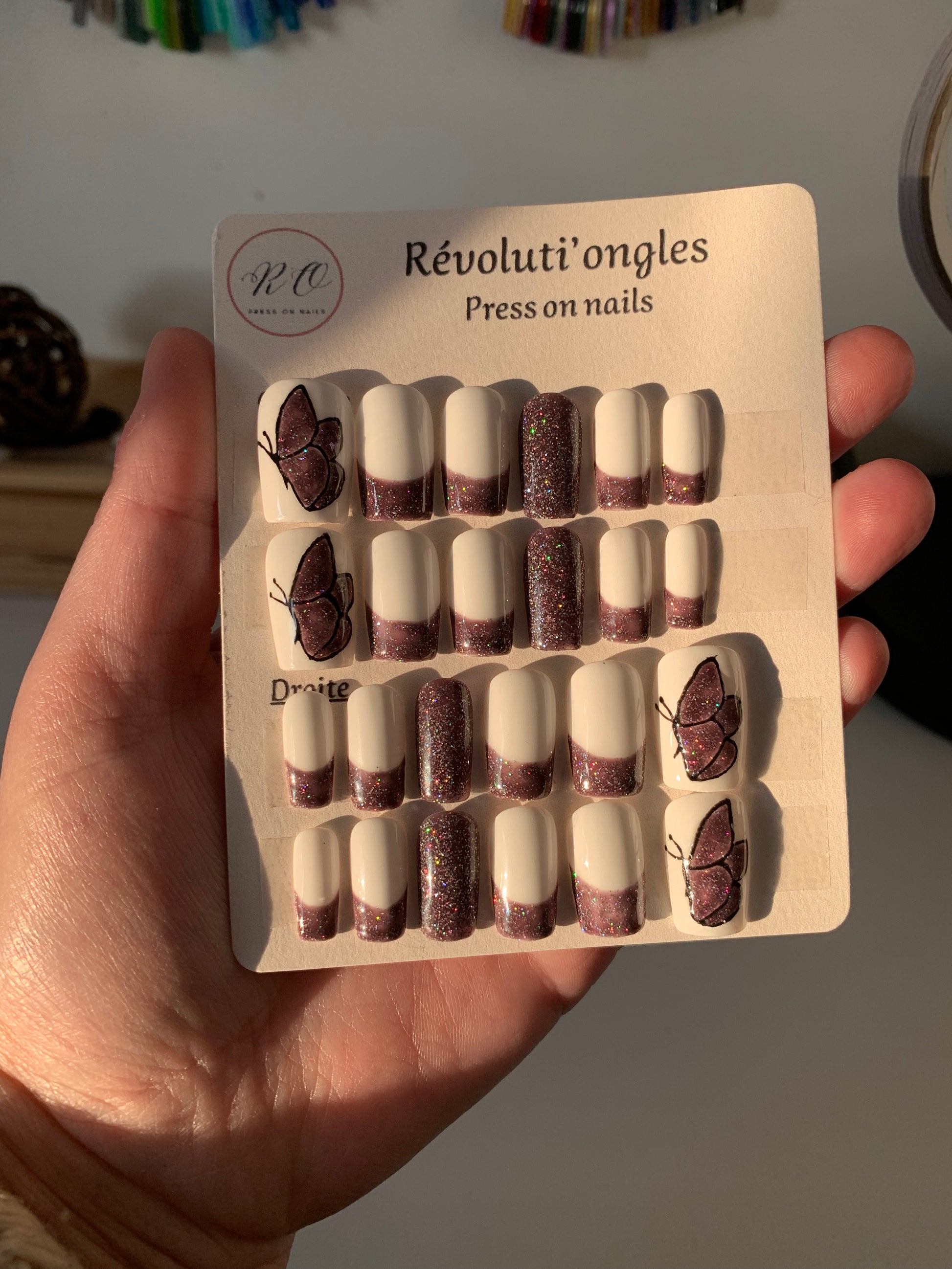 Il est composé de 24 capsules de forme carré moyen. Un kit de pose est fourni avec le set de press on nails.
