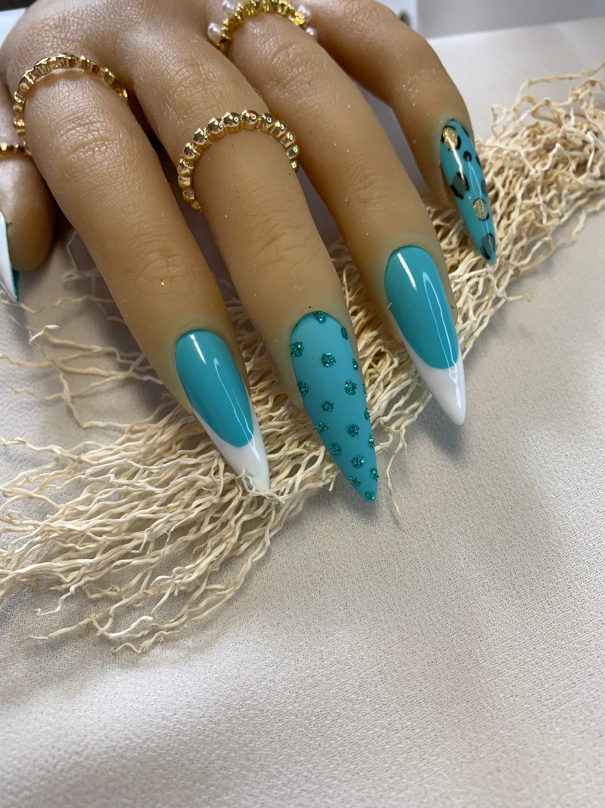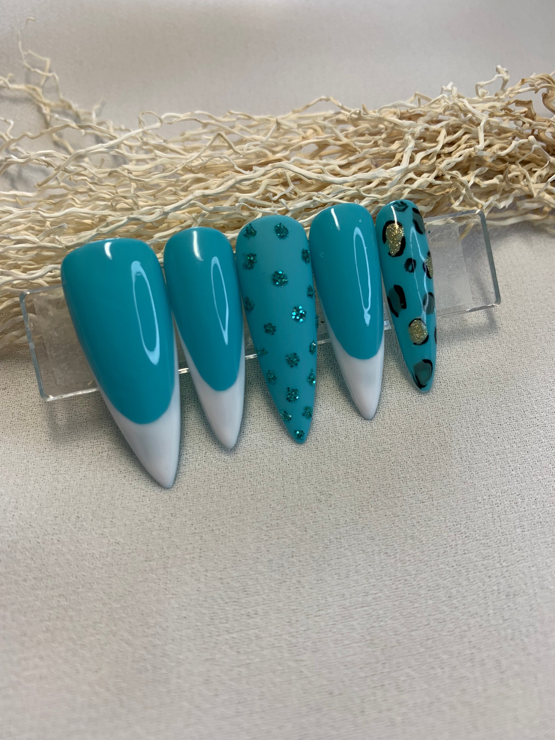 Sublimez vos mains avec ce set de press on nails au design unique alliant une teinte bleu ciel raffinée au motifs variés, incluant une élégante French manucure, des paillettes scintillantes et un imprimé léopard doré pour une touche audacieuse.