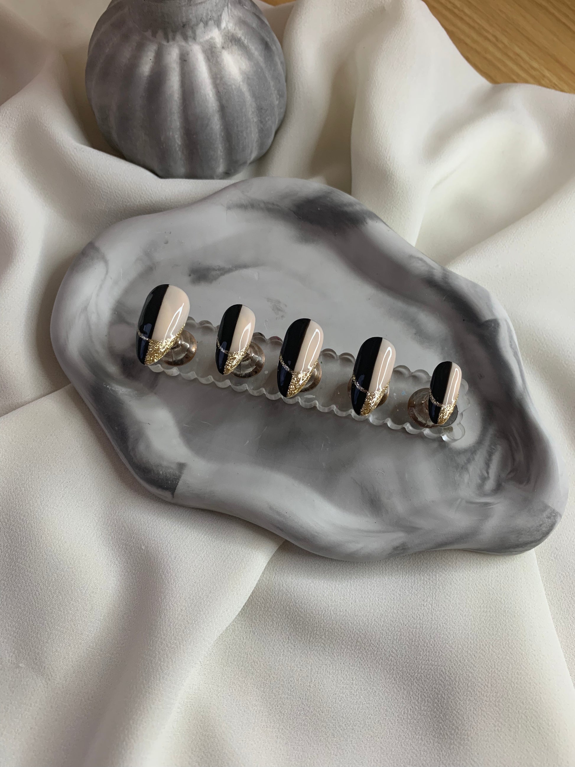 DĂ©couvrez notre modĂšle Nude Glam, une crĂ©ation chic et sophistiquĂ©e pensĂ©e pour celles qui veulent une manucure Ă©lĂ©gante, moderne et prĂȘte en quelques minutes. Ces press on nails nude et noir sont embellis dâun dĂ©licat accent dorĂ© scintillant, qui apporte une touche glamour tout en restant raffinĂ©.