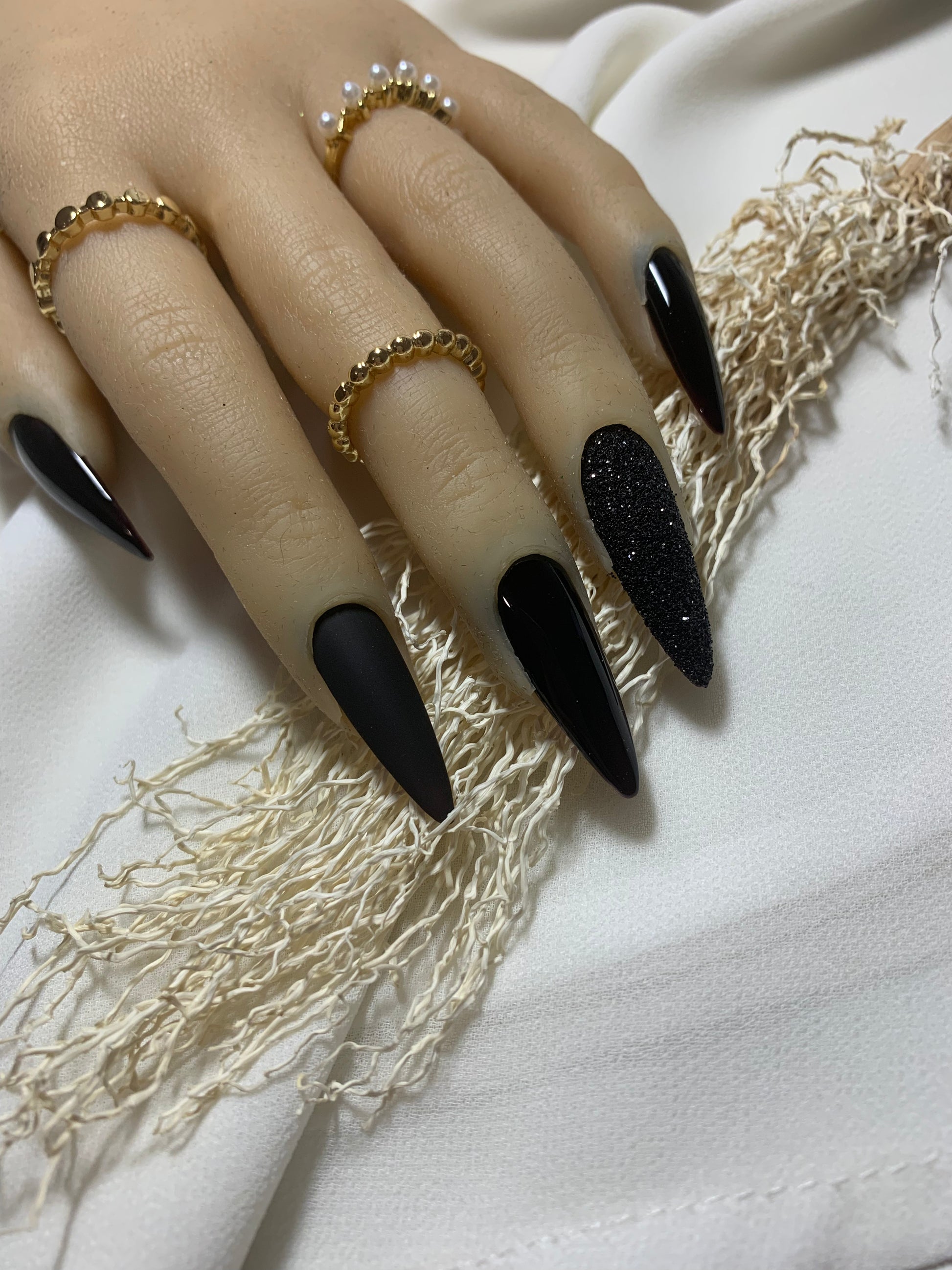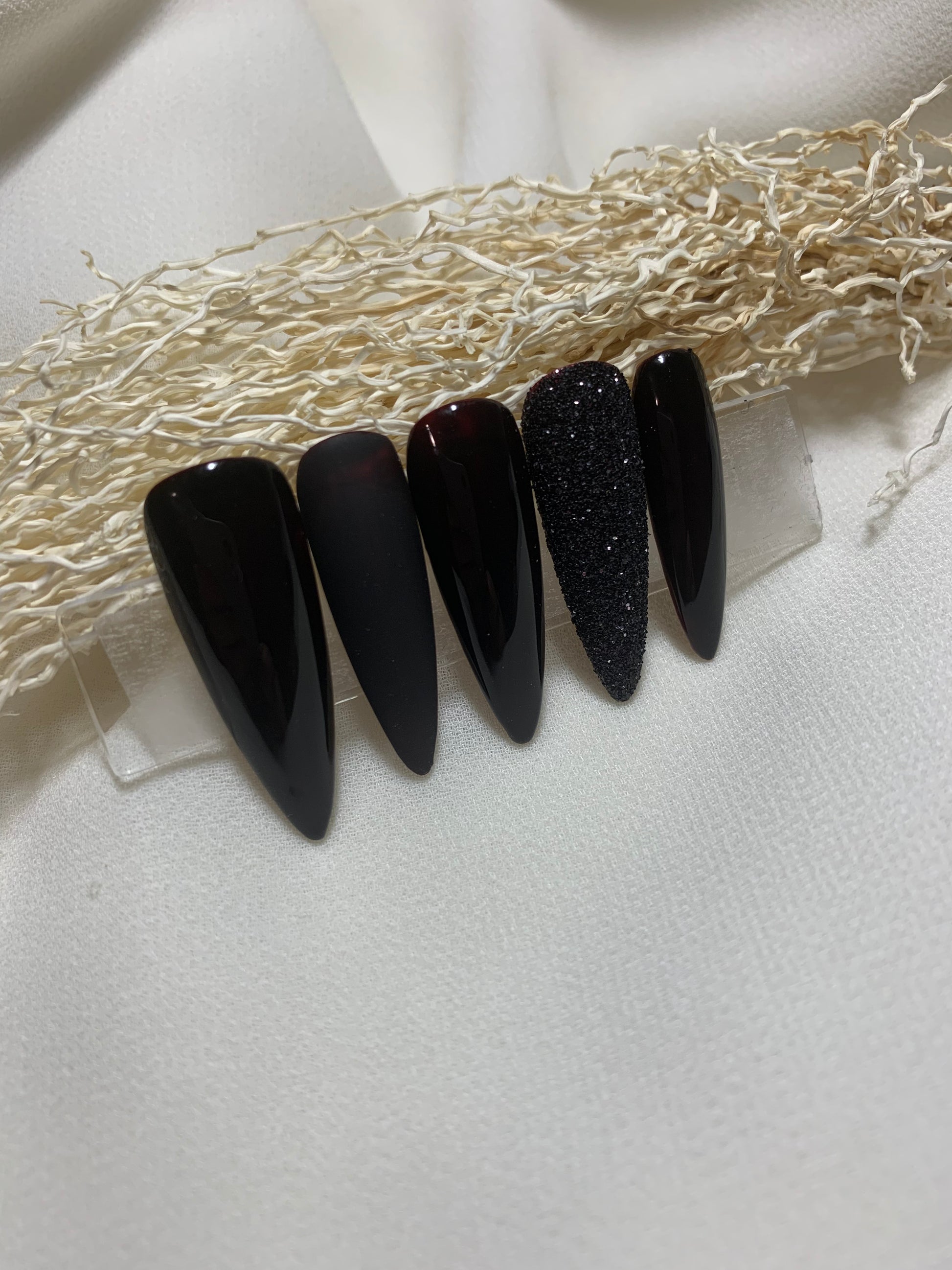Chaque ongle révèle un noir profond, décliné en finitions brillantes, mates et texturées, pour un effet à la fois moderne et intemporel. Sous la surface, un rouge vibrant se cache, tel un secret précieux, réservé à celles qui osent affirmer leur pouvoir avec élégance.